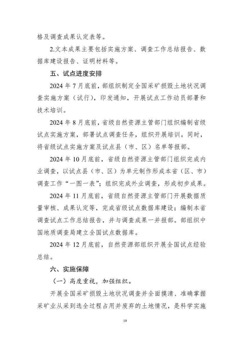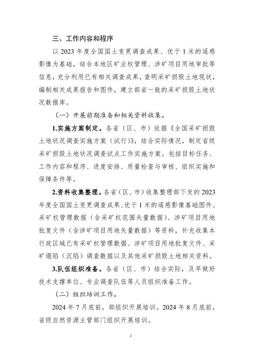 2024年7月底前,部組織制定全國采礦損毀土地狀況調(diào)查實(shí)施方案(試行),印發(fā)試點(diǎn)通知,開展試點(diǎn)工作動員部署和技術(shù)培訓(xùn)。